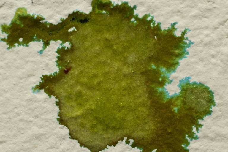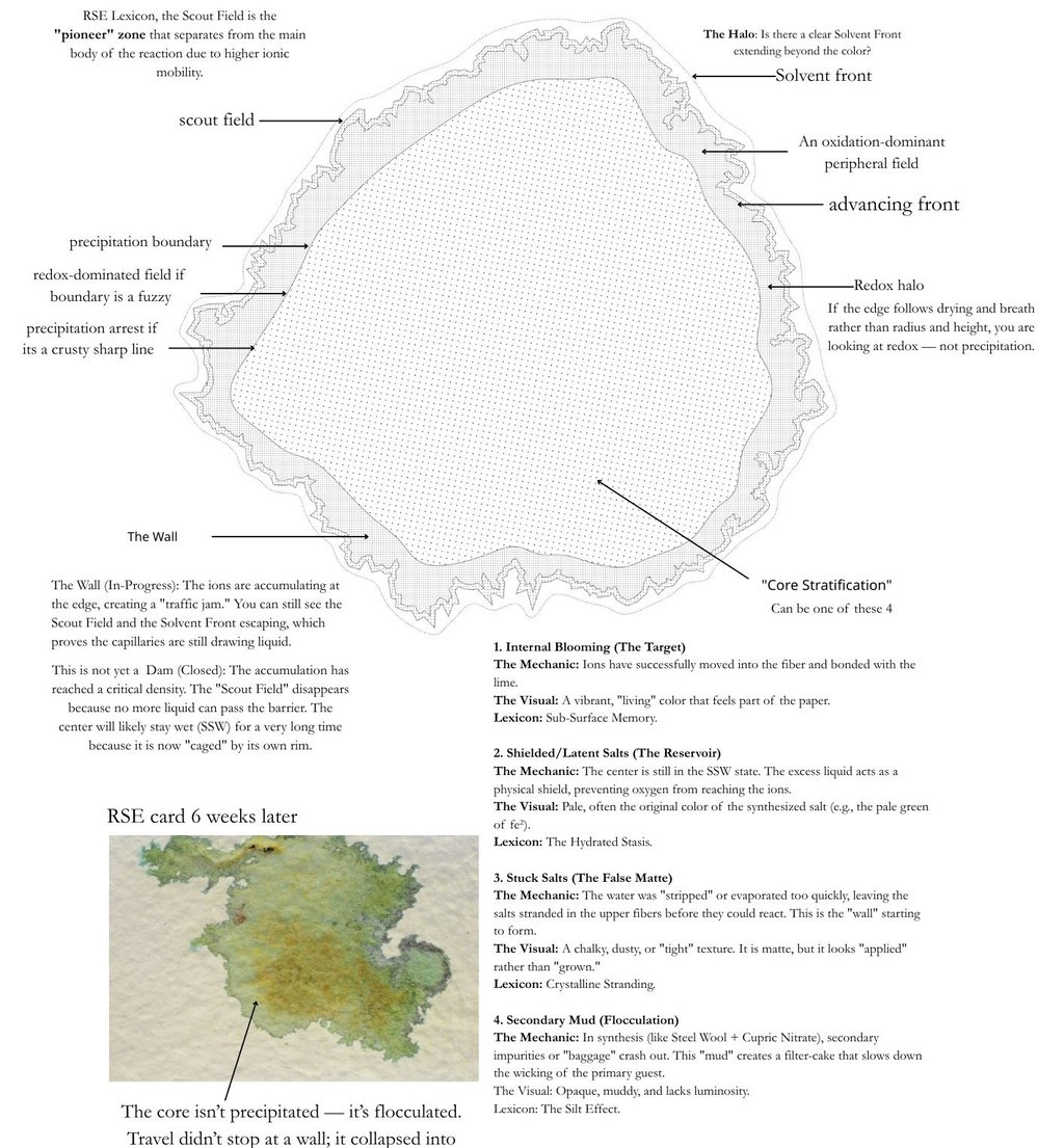 What you’re looking at A nickel nitrate RSE card showing a pale blue-green halo advancing ahead of the main olive core. The halo is detached from the bulk stain and rides the outer capillary edge.