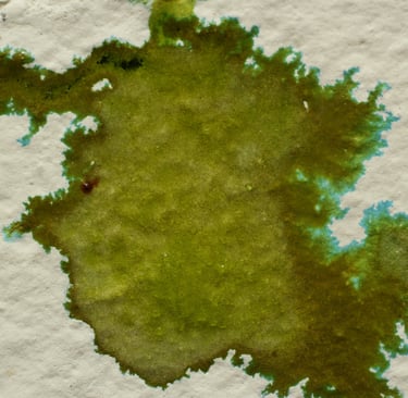At the advancing edge, nickel forms lower-density, hydrated hydroxide / oxide complexes that favor blue-green tones. In the center, where moisture is thicker and oxygen is limited, the system settles into olive and sage states